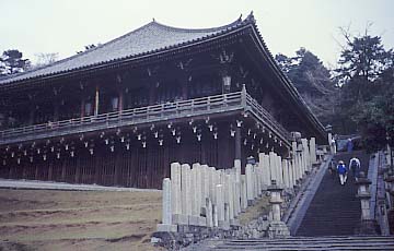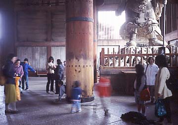 back side of Buddha![]() at the back room of "Daibutsu-den", there is a pillar with a hole at the bottom of it. The size of the hole is the same as that of Daibutsu's nostril. They say "it's luck if you can pass through the hole." (might be the meaning of not to be fatty :-)) go out of Daiutsu-den looking at Naka-mon then, let's go to "Nigatsu-dou" (meaning "temple of February") go up and up (and sometimes left) then arrive at Nigatsu-dou next |