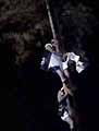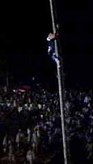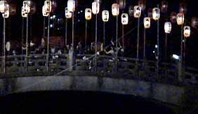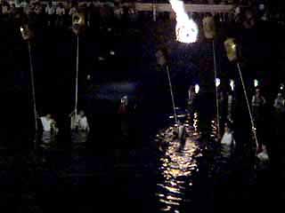 松明と提灯の火に先導されて、御輿が川を上ってきます。