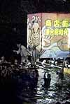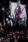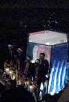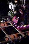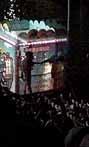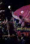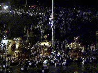 本体の御輿を迎える山車が、川の中に入ってきます 2〜3年前は、もっとたくさん出ていたような気がします。ここにも不景気の風がふいているせいでしょうか