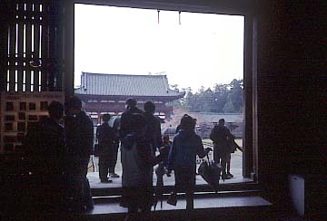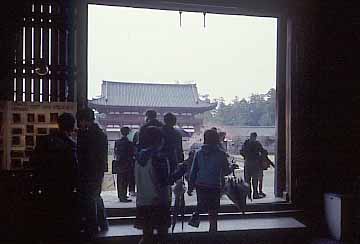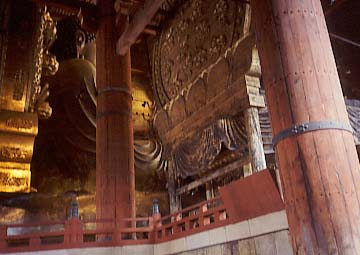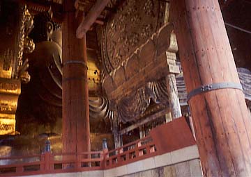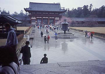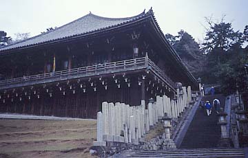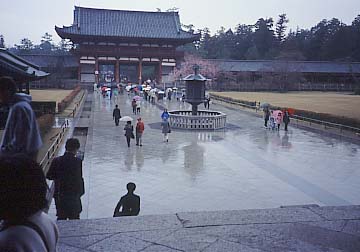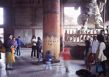 back side of Buddha![]() at the back room of "Daibutsu-den", there is a pillar with a hole at the bottom of it. The size of the hole is the same as that of Daibutsu's nostril. They say "it's luck if you can pass through the hole." (might be the meaning of not to be fatty :-)) go out of Daiutsu-den looking at Naka-mon then, let's go to "Nigatsu-dou" (meaning "temple of February") go up and up (and sometimes left) then arrive at Nigatsu-dou next |