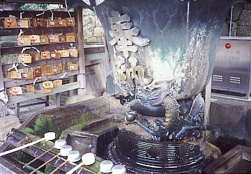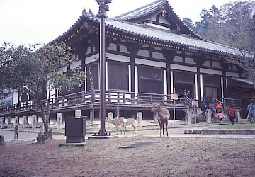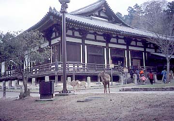 looking back at the top of the stone steps, you see "Daibutsu-den".![]() scenery of Nara from the stage of Nigatsu-dou I like the scenery of ancient capital you see Daibutsu-den is directly in front of Nigatsu-dou look at the "Chouzu-ya" (hand purifying place) another dragon is there at the ceiling of this shed again looking back at Nara in the steps to Fudou-dou Sangatsu-dou (meaning "temple of March") standing in the south of Nigatsu-dou, keeps many famous statue such as Nikko-bosatsu, Gekko-bosatsu and so on ...